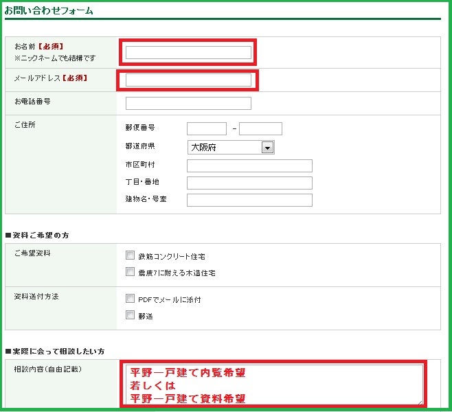 その問い合わせフォームの「相談内容欄」に「平野一戸建て内覧希望」若しくは「平野一戸建て資料希望」とお書き頂き、資料をご請求ください。