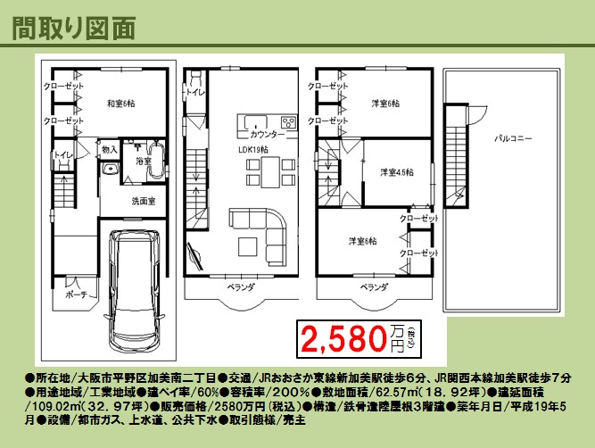 あなたは、平野区加美南2丁目(加美駅徒歩6分、JR関西本線加美駅徒歩7分)で、平成19年建築の鉄骨造中古一戸建てが売りに出ているのをご存知ですか。