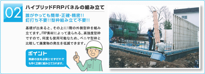 - 基礎が出来上がるとその上に1階の外型枠を組み立てます。世界特許のFRP枠型パネルによって作られる、高強度型枠です。