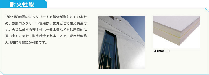 - 180㎜厚のコンクリートで躯体が作られている為、鉄筋コンクリート住宅は。家まるごと耐火構造なんです。ですから、火災に対する安全性は一般木造住宅等とは圧倒的に違います。又、耐火構造であることで、都市部の防火地域にも建築が可能ですから嬉しいですよね。